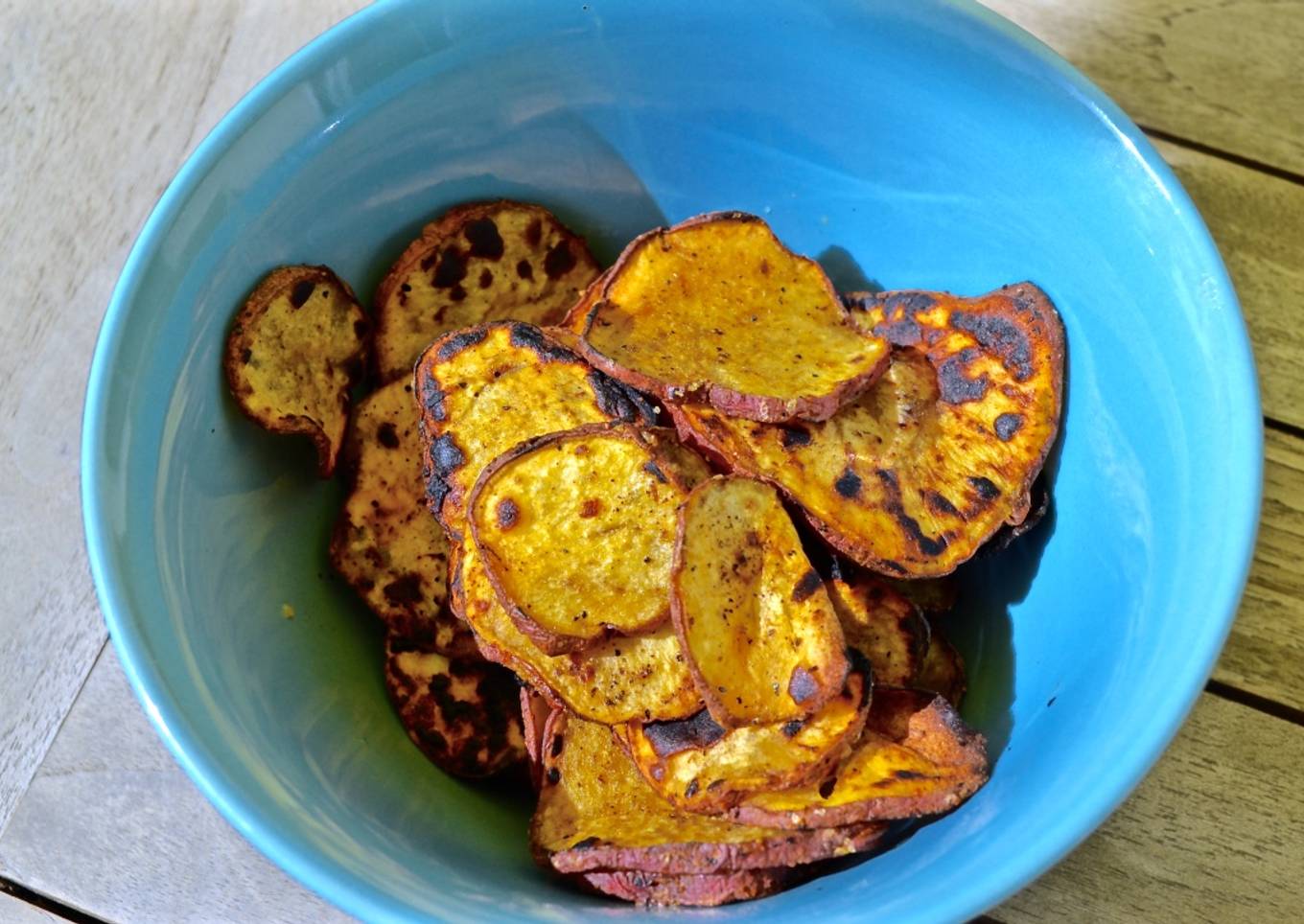 Uno de mis acompañantes favoritos para la carne asada o para un pollo a la parrilla son las chips de papas horneadas. Sin embargo, hay muchos otros tubérculos con los cuales podemos hacer chips naturales y los camotes son uno de estos y son deliciosos :) . Tienen la misma consistencia que las papas pero además tienen un saborcito dulce al final que los hace irresistibles!!!