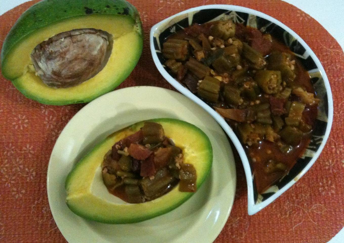 Guiso de quimbombó y beicon en canoa de aguacate