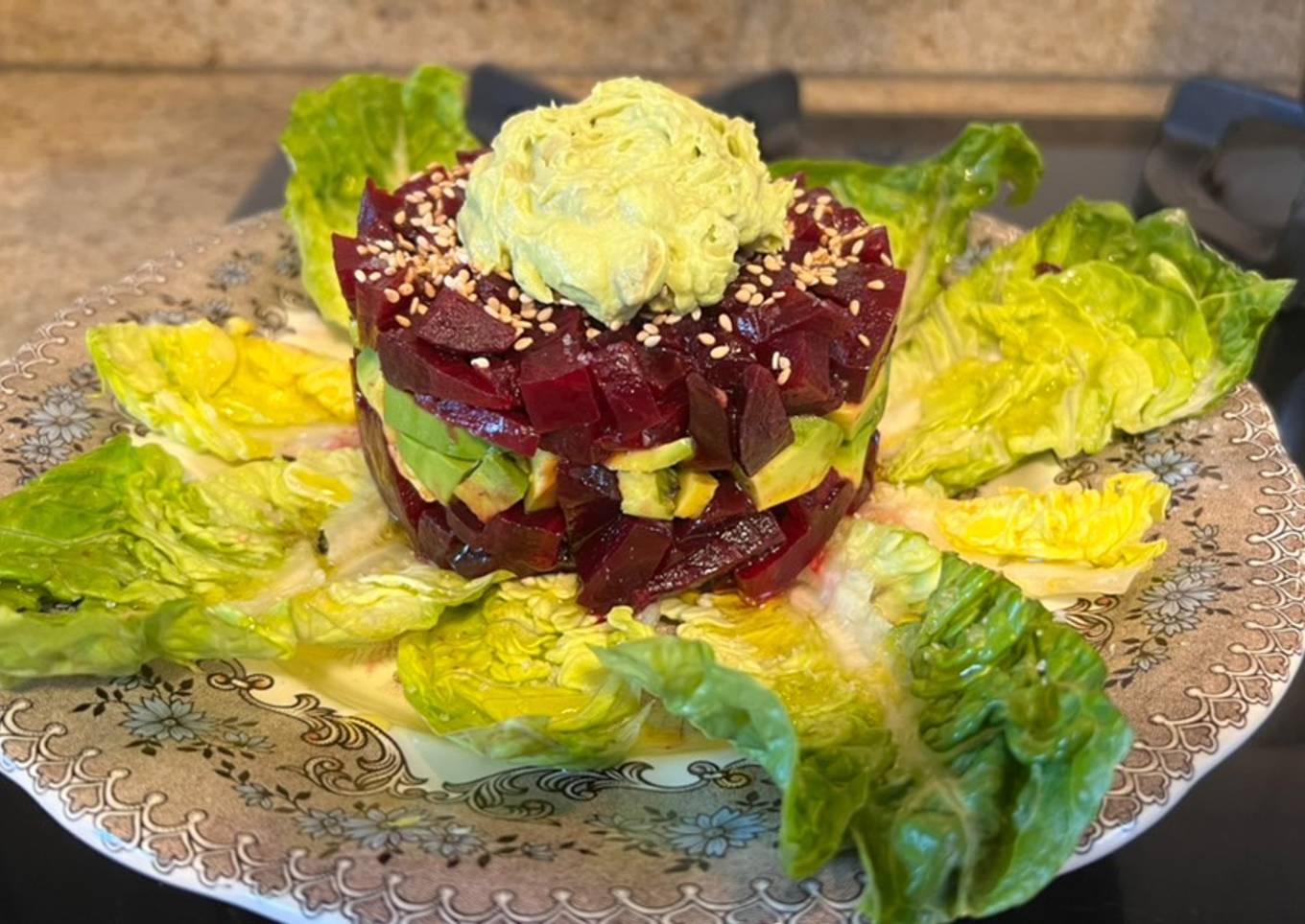 Tartar de remolacha y aguacates con mahonesa de aguacates
