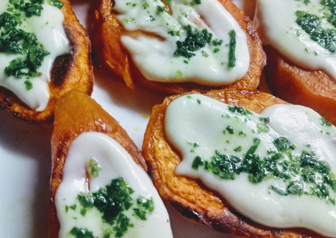 - Lavar muy bien con cepillo las batatas con cáscara (yo conseguí esas mas anaranjadas dulces, me gusta el contraste con el queso). Se puede usar con la cáscara o pelar, va en gusto. Cortar rodajas de 1 cm de espesor. Acomodar en una asadera o placa untada con aceite. Llevar a horno precalentado a 200°. También se pueden hacer de la misma forma en olla Essem.