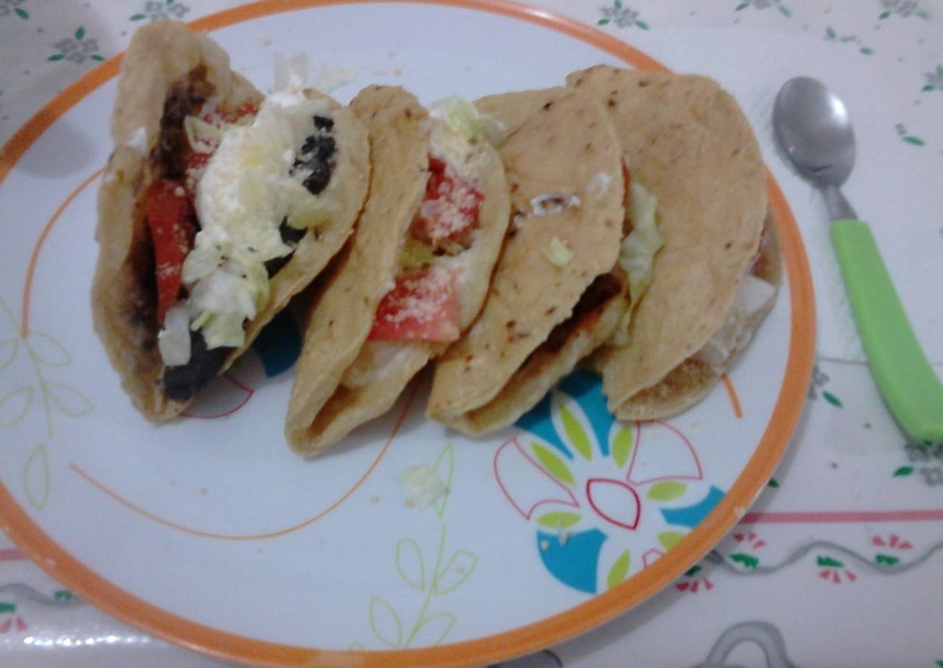 - Calentar las tortillas en un comal (plancha) y cuando estén suaves agregar a cada una el relleno. Para cuatro personas resultarán 8 de queso, 4 de frijoles, 4 de papa y 4 de chorizo.