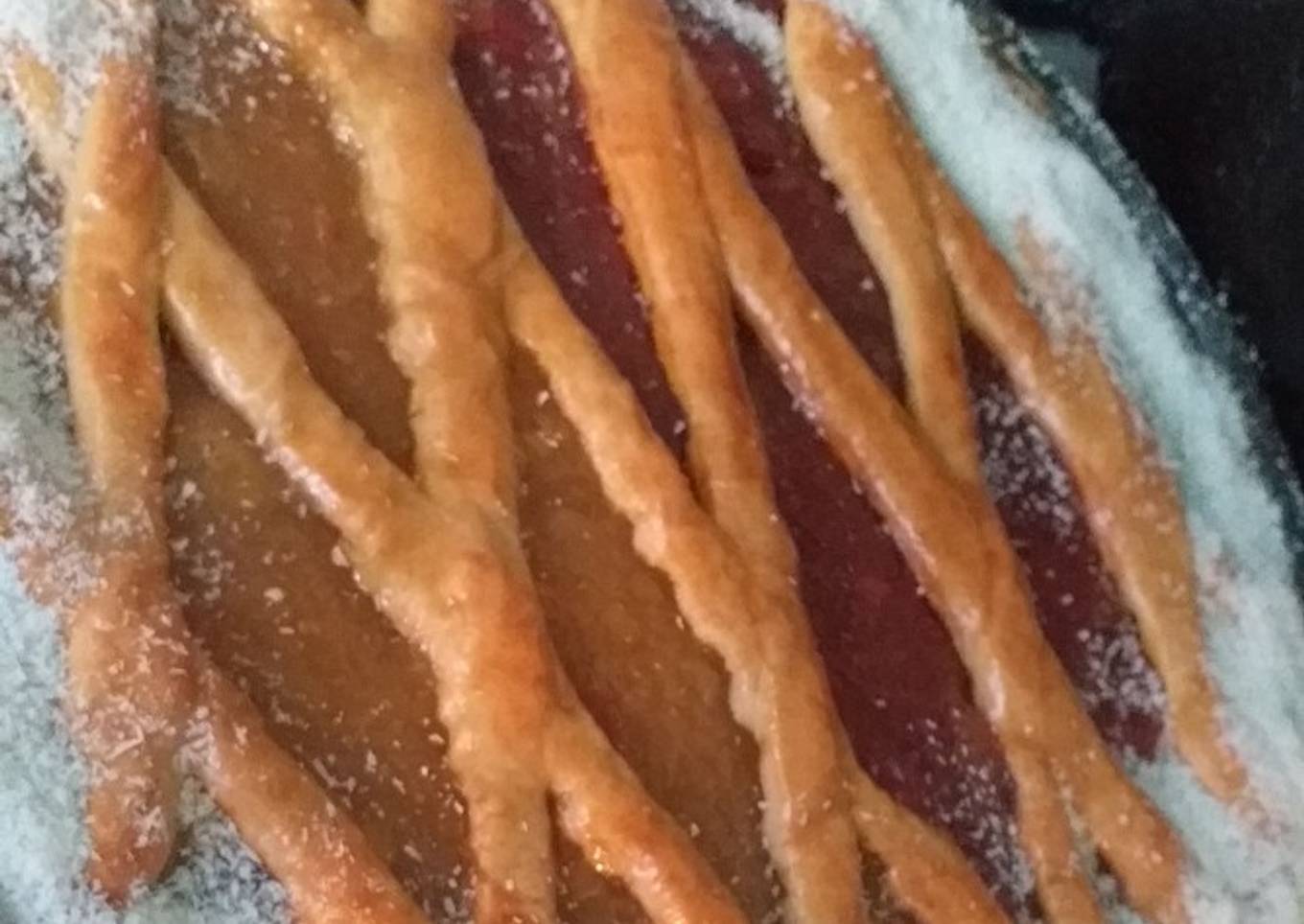 - Una vez colocadas las tiras, llevamos la pastafrola al horno pre-calentado a 180° durante 30 a 40 min, dependiendo del horno. (Pueden pintar con huevo si quieren) una vez cocinada la pastafrola dejar enfriar y espolvorear con coco, esto es opcional.