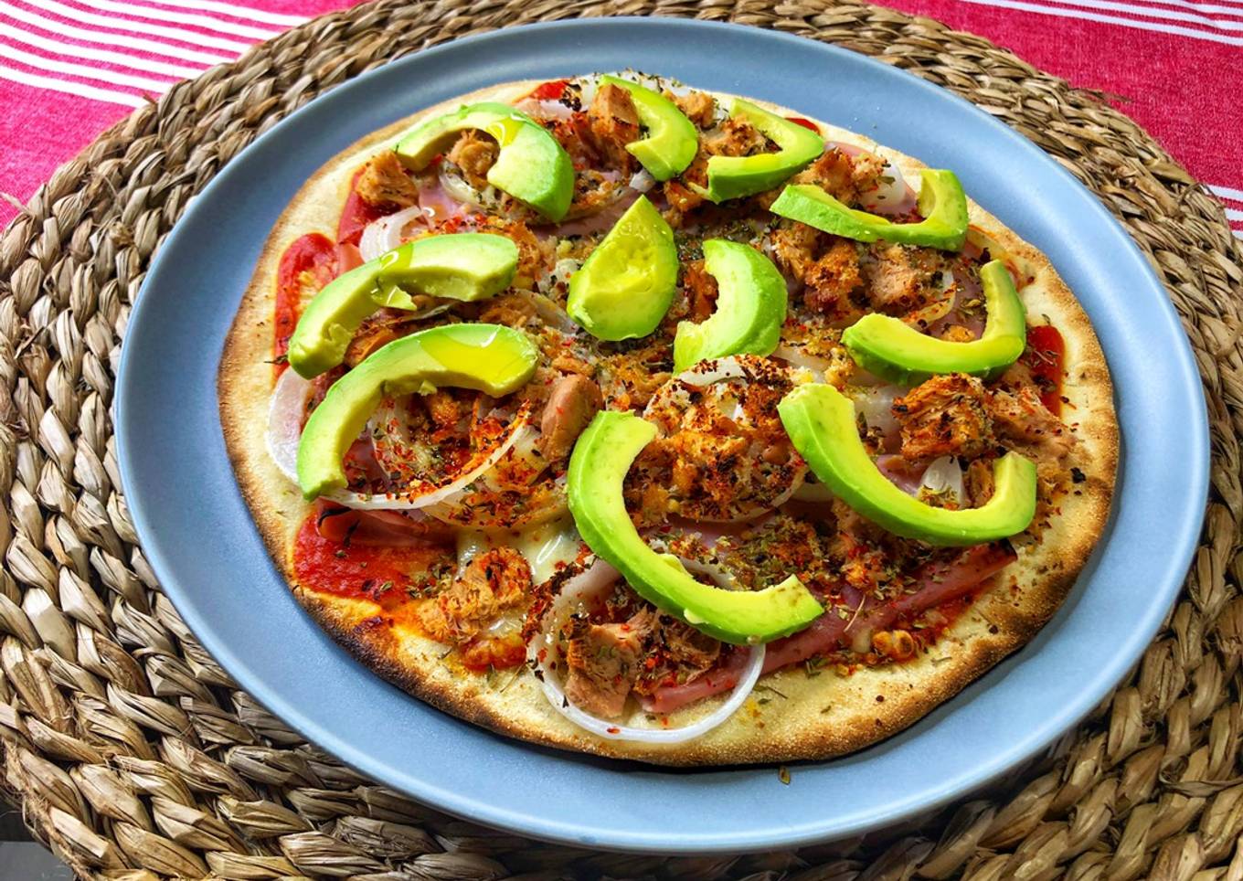 Pizza fina de atún, jamón y aguacate con ñoras 🥑