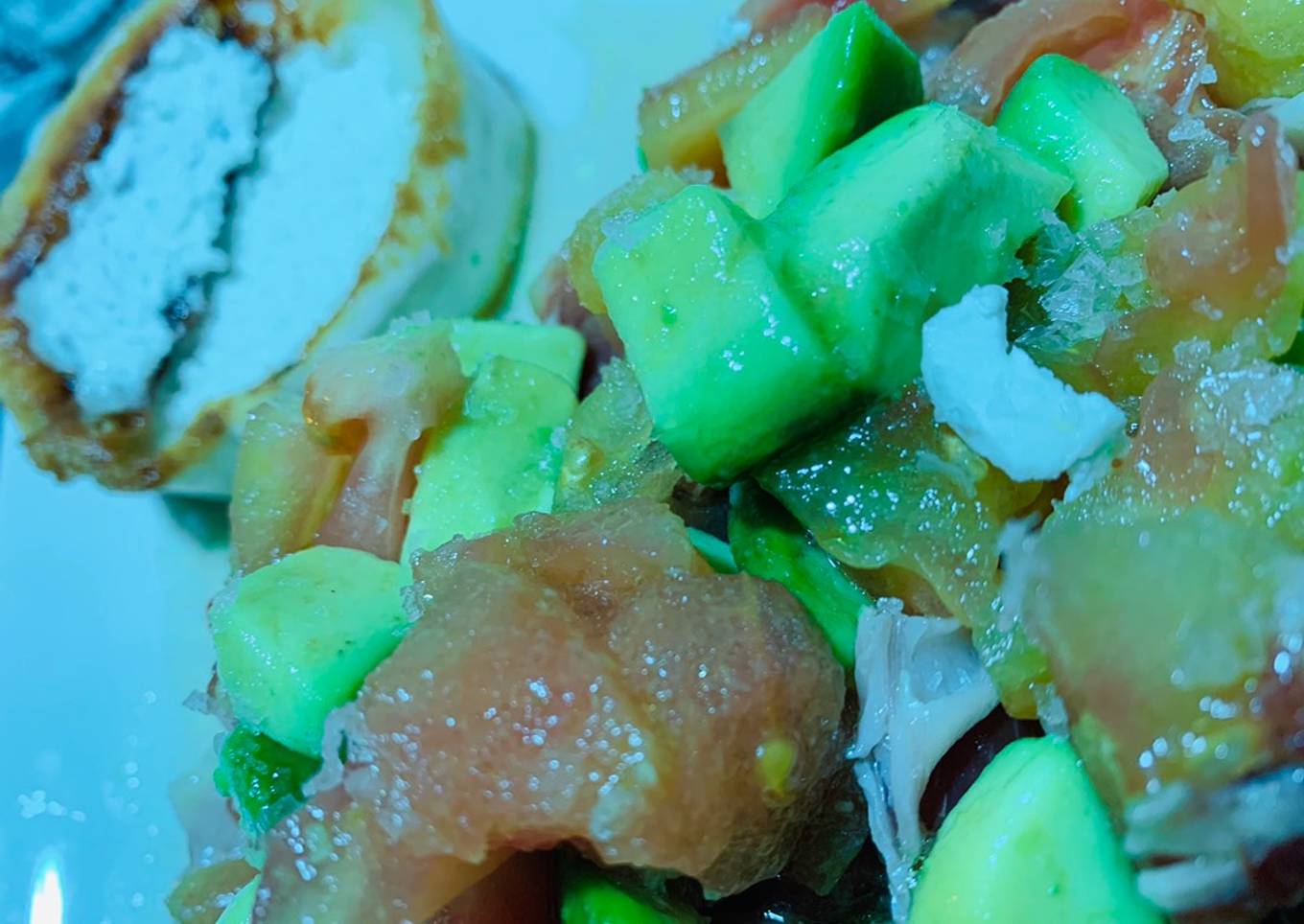 Ensalada de tomate, aguacate y jamón con queso de cabra a la plancha