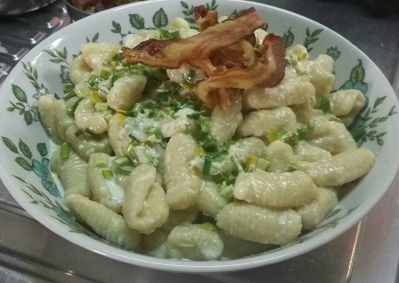 - Verter la salsa en los ñoquis con pedacitos de panceta y queso rallado si se desea.